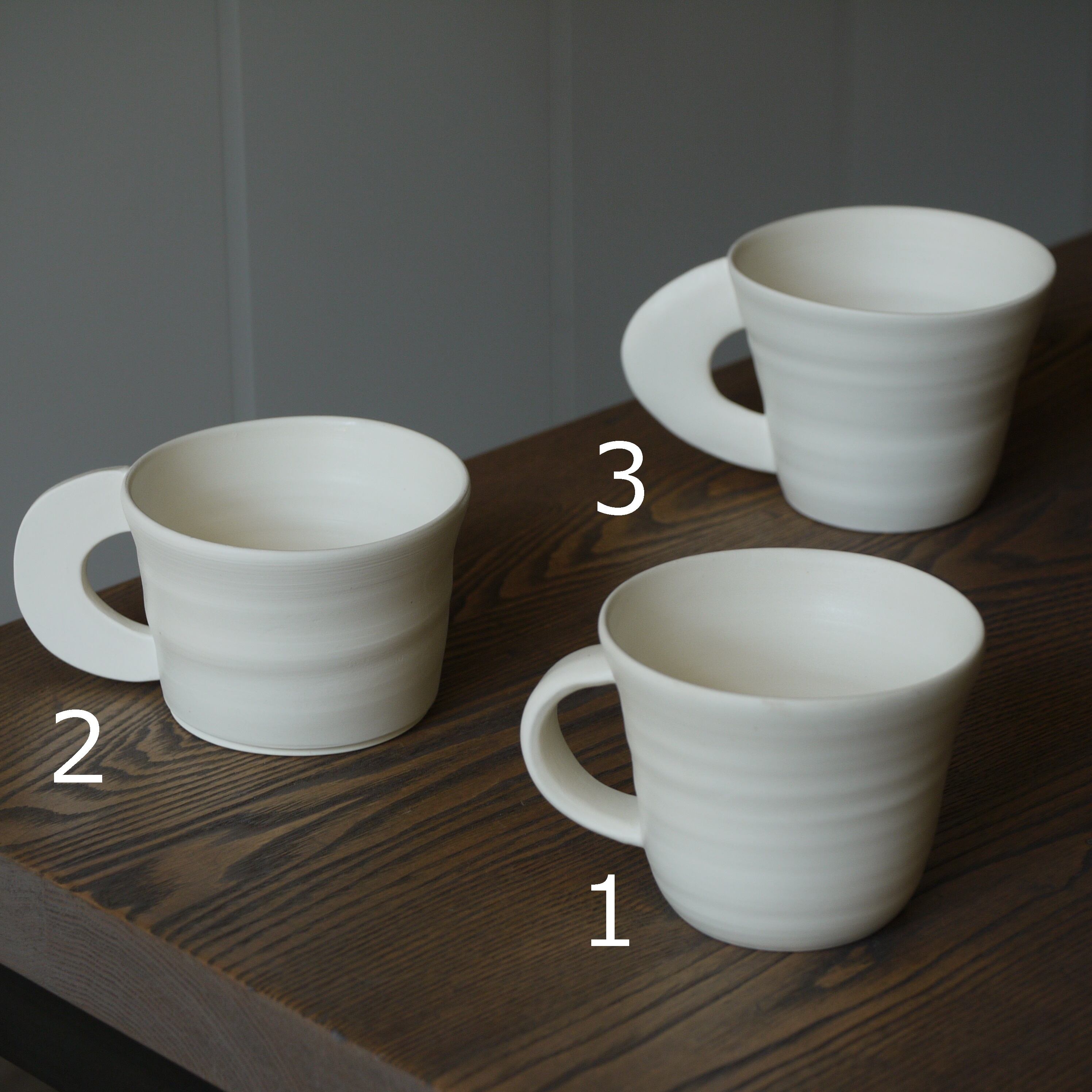 取っ手の形が異なる、白いマグカップの3兄弟です。