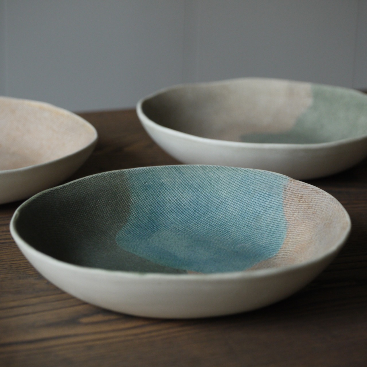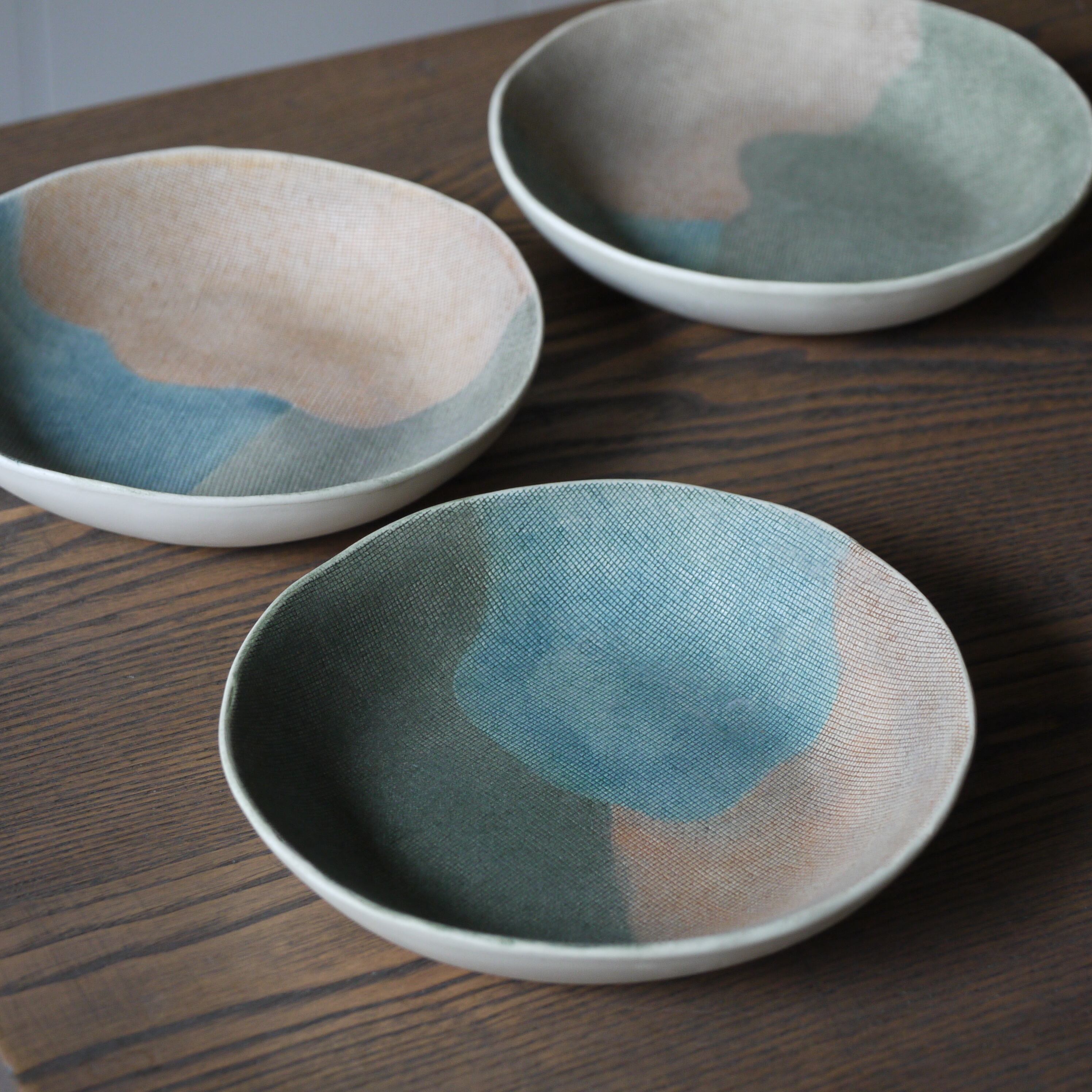 グリーン、オレンジ、ブルーが調和する、色鮮やかな布目小鉢です。