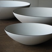 透き通るような磁土に、細かい鎬(しのぎ)が上品に走るボウルです。放射状の広がりをキュッと引き締める縁の錆色がアクセントになっています。